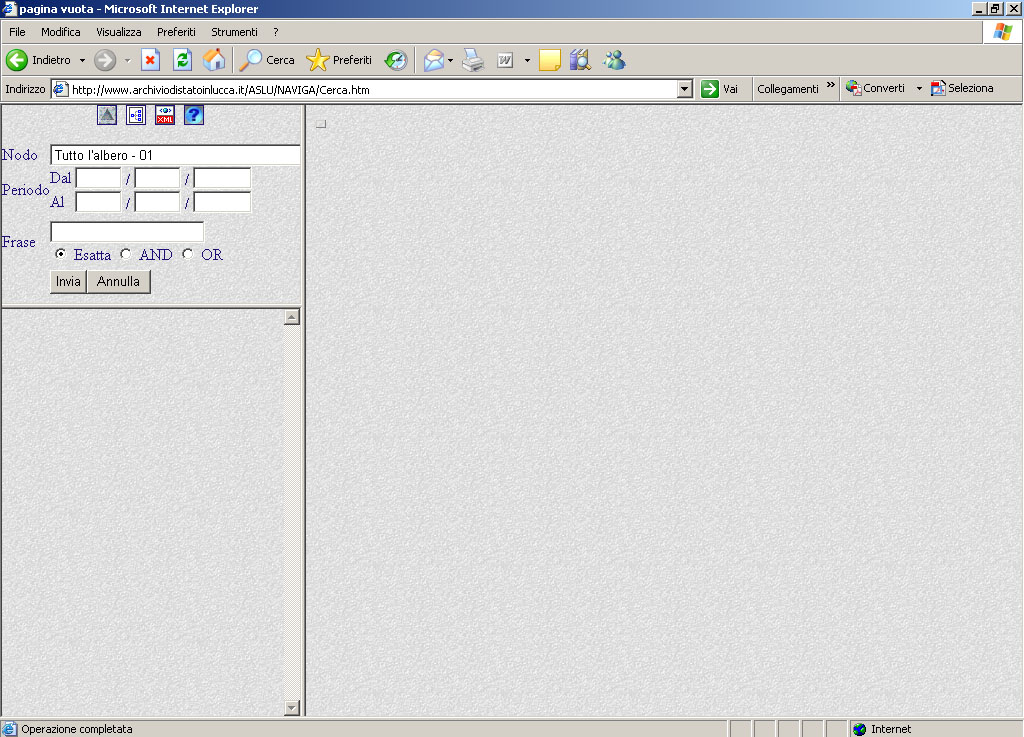 strumento per la ricerca nell'Archivio e_ASLU. Consente ricerca selettiva all'interno di un singolo fondo, per data o periodo, di una frase o gruppo di parole singole. La presentazione dei comandi di ricerca è particolarmente semplificata per consentire un approccio immediato.